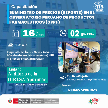 La Dirección Regional de Salud Apurímac, a través de la Dirección Ejecutiva de Medicamentos, Insumos y Drogas, realizo la IV Campaña Nacional de Farmacovigilancia y Tecnovigilancia- Reportar puede salvar Vidas- “Taller…